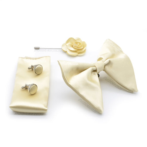 View full detailsSimplify the headache of colour matching with this elegant ultra light yellow cream bow tie, lapel flower, cufflinks and pocket square set. The bow...