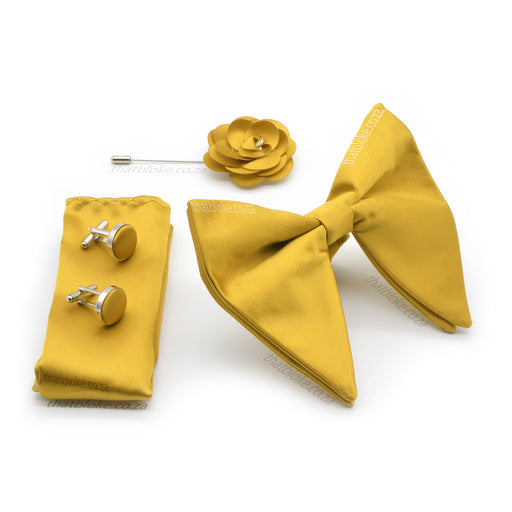 View full detailsSimplify the headache of colour matching with this elegant vibrant yellow gold bow tie, lapel flower, cufflinks and pocket square set. The bow tie ...
