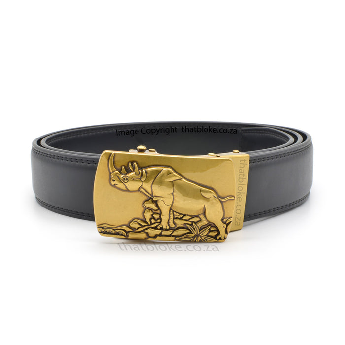 A unique novelty animal belt in black with a brass/bronze South African Rhino buckle. This expertly crafted belt is easy to adjust with its ratchet system and quickly releases by using its belt release clip at the bottom of the buckle. The belt can easily be shortened, so make sure you select a larger size rather than one that is too small.