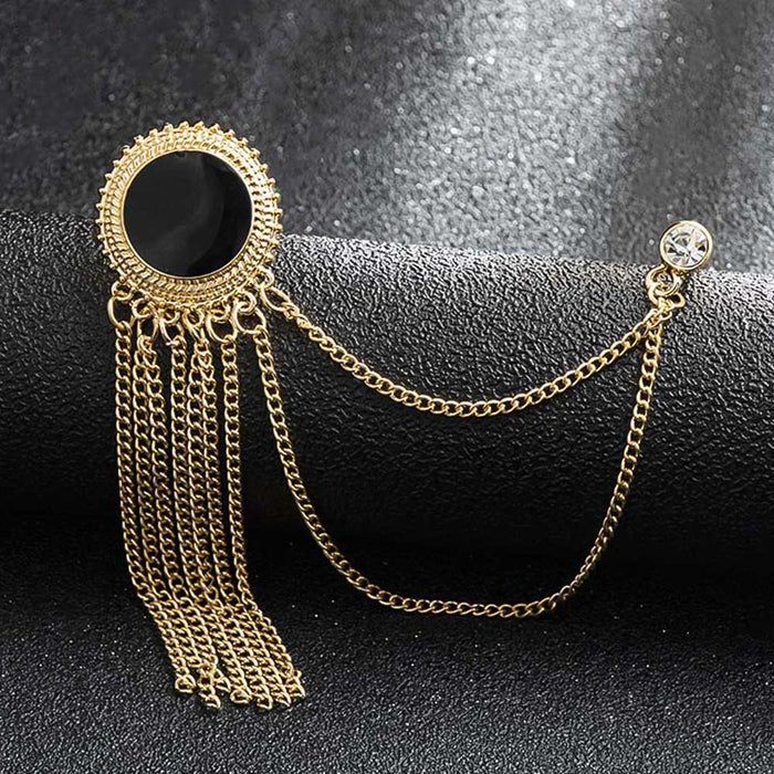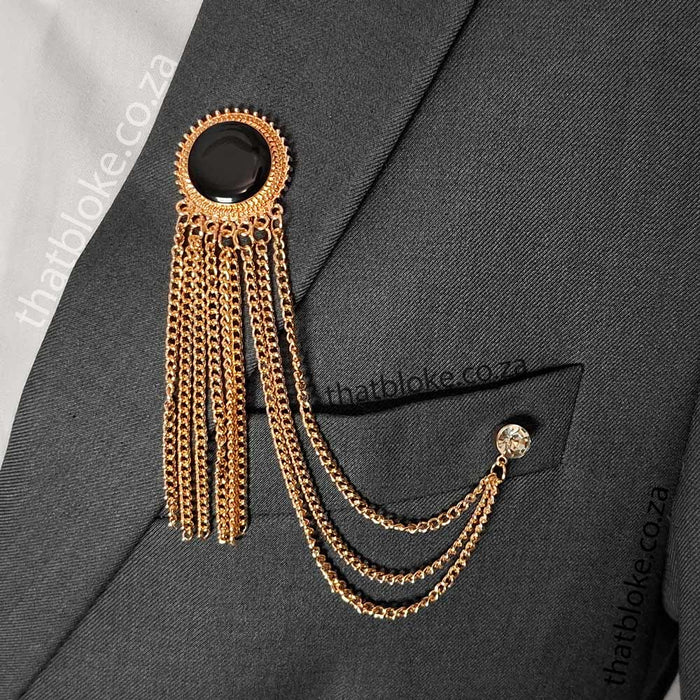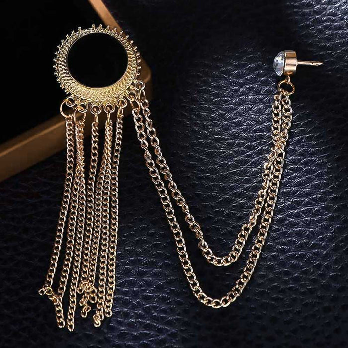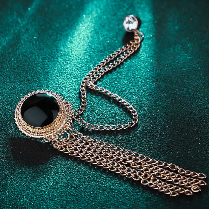 This Decorative Circular Brooch in rose gold features tassel chains and a black stone in the centre, perfect for adding a touch of flair to your blazer or suit. It's a stylish and essential accessory for men's fashion.