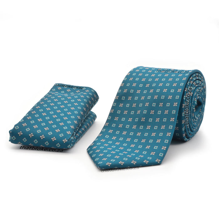 Neck Tie - Blue Teal Deep With Pocket Square (Foulard Geometric Pattern)